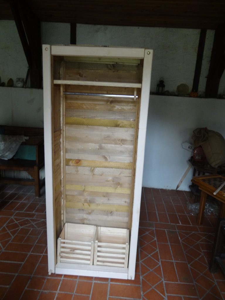 En fait semble-t-il cet avant-propos un peu emberlificoté, pour nous amener à découvrir l’astuce géniale permettant un assemblage in situ, de cette penderie « cabinet » ou « guérite », ( ce sont les images qui me viennent à l’esprit !), une fois ses composants astucieusement usinés et péniblement hissés à l’étage via ce fameux escalier.