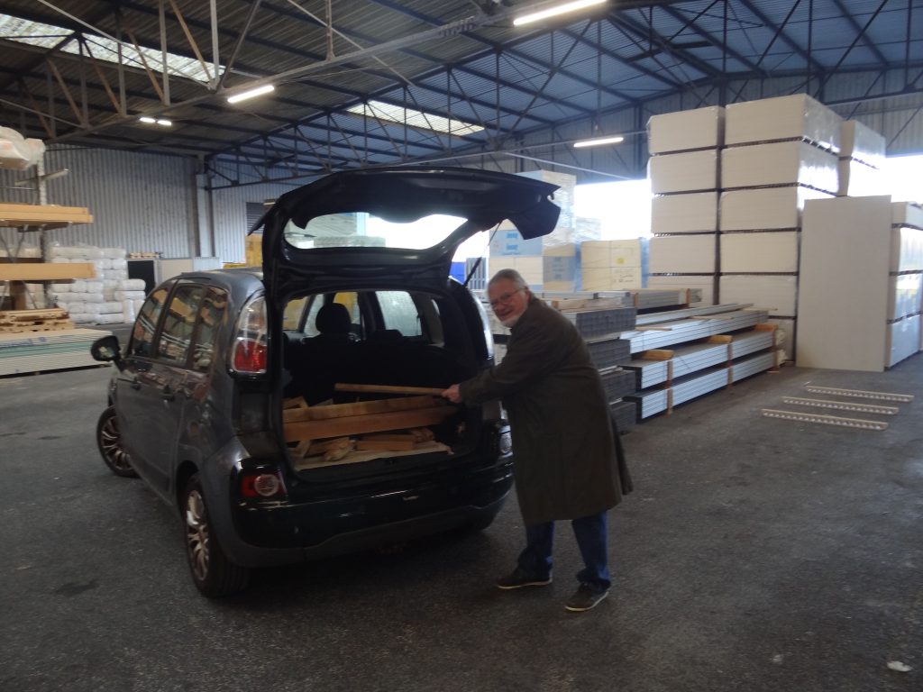Une opportunité m’a été donnée il y a 40 ans et qui dure encore aujourd’hui, de me fournir en bois gratuitement. Quelle bonne fortune pour mon porte-monnaie ! Je n’ai jamais acheté de matière première, j’ai sympathisé avec le personnel d’un gros marchand de matériaux spécialisé dans la construction. Je récupère des bouts de bois qui servent comme cales d’emballages de certains matériaux qui leur sont livrés par les fournisseurs.
